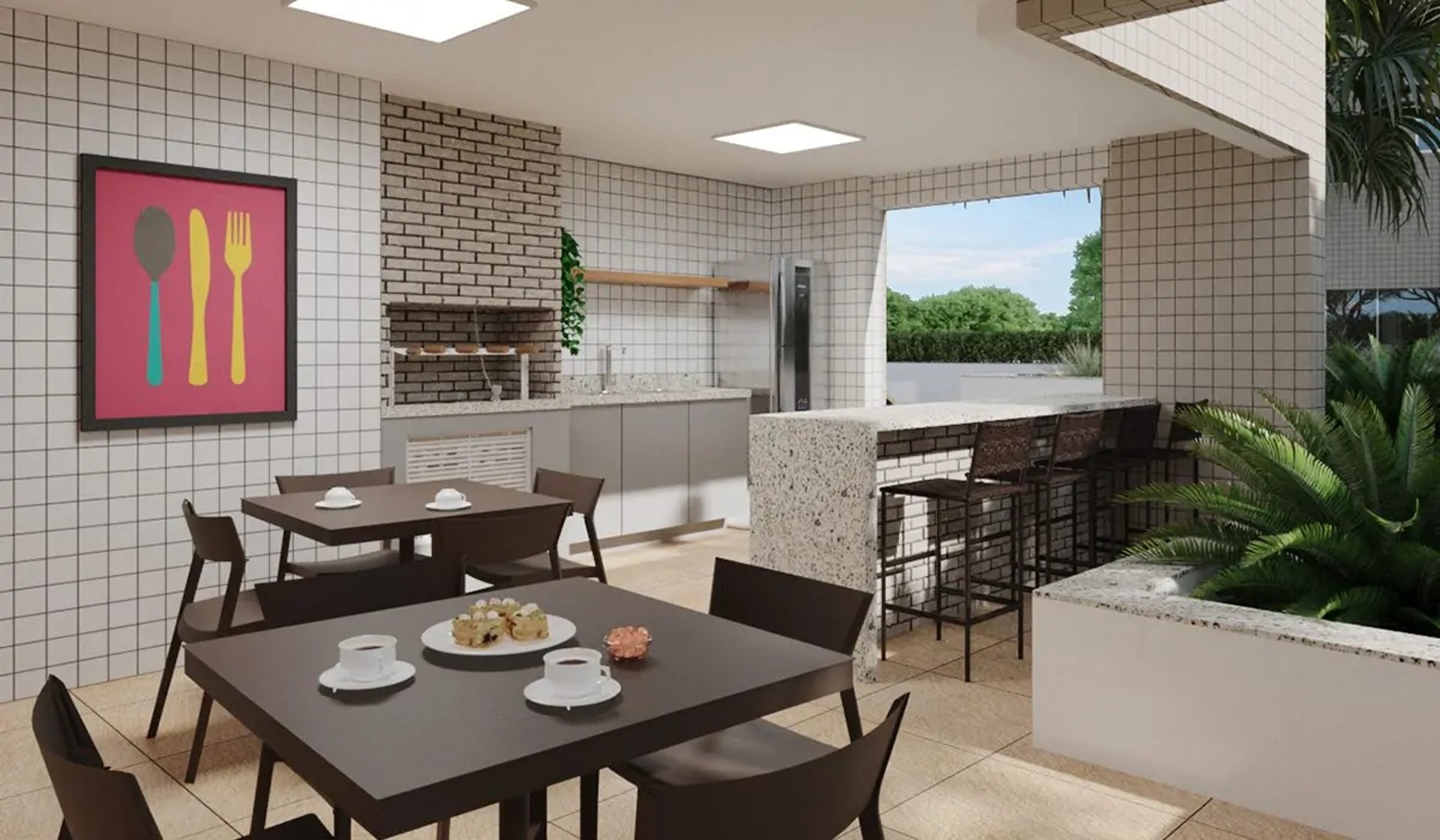 Área do apartamento: 43,29m² | 2 quartos, sendo 1 suíte | Varanda